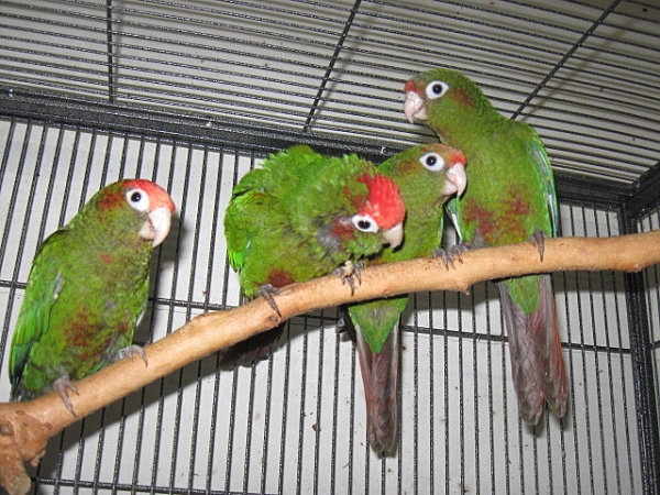 Coloración: cuerpo verde, frente y mejillas de color rojo. Vientre rojo parduzco.